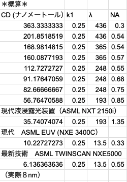 ピッチ、パターン(模様)のサイズが小さくになると違う性能の機械が必要です。Rayleigh Criterion:によると、波長が小さくなると、CD(最も小さい線の幅)が小さくなる。なぜこれを狙うのかは、トランジスタが小さくなると、一定の面積に入るチップ(トランジスタ)が増えるから。NAの方はレンズの分解能を示すパラメータです。NAが大きくなるとCDが小さくなれるです。